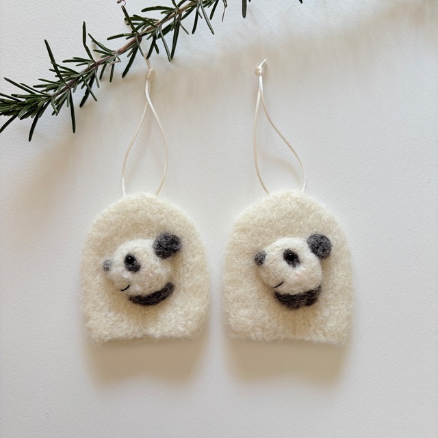 パンダ柄のキーケースです。 横顔がシンプルながら可愛いです。 鍵を付けたり、バックチャームにしても可愛いです。 ギフトにも! こんなキーケースあったらいいなぁと思いデザインしました。 生地は、約2倍の大きさにメりノ毛糸を編んで縮絨させて(フェルト化)して仕上げました。 しっかりしたお造りで丈夫で長持ちします。 鍵の金属をフェルティングニットで優しく包み込みバック中に入れても他のものを傷つけにくくします。 家に帰ったら壁にかけて飾ってくださいね。 ギフトにもお使いいただいております。 無料ラッピングしておりますのでお申し付けくださいね。 一つ一つ手作りのため写真と若干異なる場合がございます。 キーケース1点の価格です。 ★ 紐のお色が類似のものに変更になる場合がございます。 サイズ  約75mm×80mm(本体部分)、メりノ羊毛、金属25mm