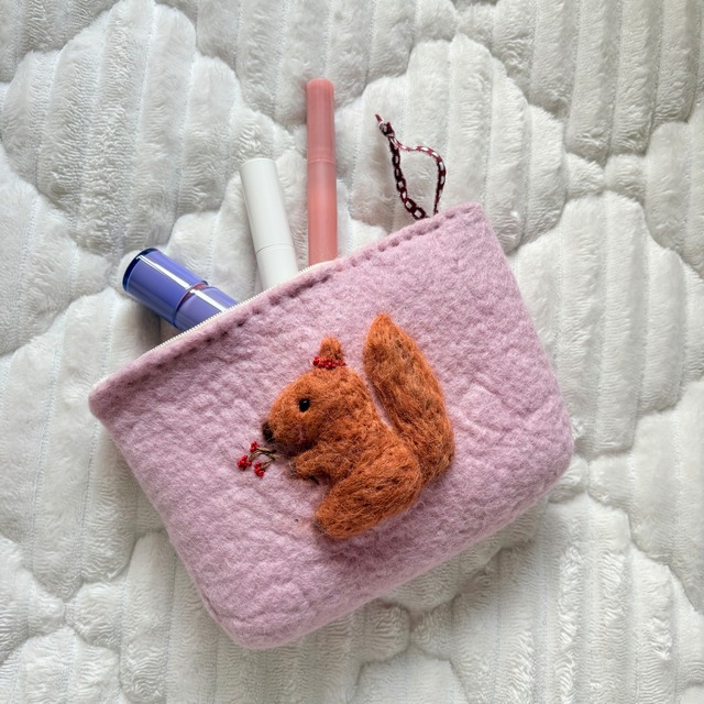 赤リスさんのフエルトポーチです。 赤リスさんががナナカマドを耳に飾ったりして遊んでいます。ほっこりするような情景です。 お気に入りのリップをしまうとき、 カバンの中をのぞいたとき、 ふわりとこころがゆるむような そんな“ひと休み”を、おともに。 フェルトならではのあたたかい手ざわりと、 手刺繍の優しい表情をお楽しみください。 コスメポーチとしてもお使い頂いたり文房具を入れたり色々なモノを入れて楽しんでくださいね。 素材 メリノウール サイズ 約190mm、約145mm 羊毛から手作りしているため多少の誤差は、お許しくださいませ。 エマールなどのウール用洗剤で手洗い可能です。 ギフトにもお使いいただいております。 無料ラッピングしておりますのでお申し付けくださいね。 一つ一つ手作りのため写真と若干異なる場合がございます。