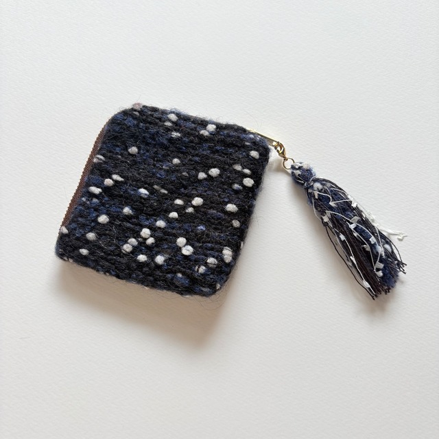 手織りツィードでドットを表現した布をを織り生地にしてポーチを作りました。 糸選びから始まって製作した手織りツィードです。 suica などのカード類やコインを入れてお使いいただけます。 ゆらゆら揺れるタッセルが可愛いです。(カニカンで取り外し可能です) お色は、ダークネイビー系です。 ギフトラッピングも無料で承ります。メッセージにてお知らせくださいませ。 ※1点1点手作りですので、柄の出方が写真と多少異なる場合がございます。ご了承ください。 表布 コットン、ウール 裏布 ポリエステル 【サイズ】約100mm*約100mm*約10mm 商品は、カードポーチ1点の価格です。 5枚目の写真は、柄違いで並べてみました! 参考にしてくださいね。