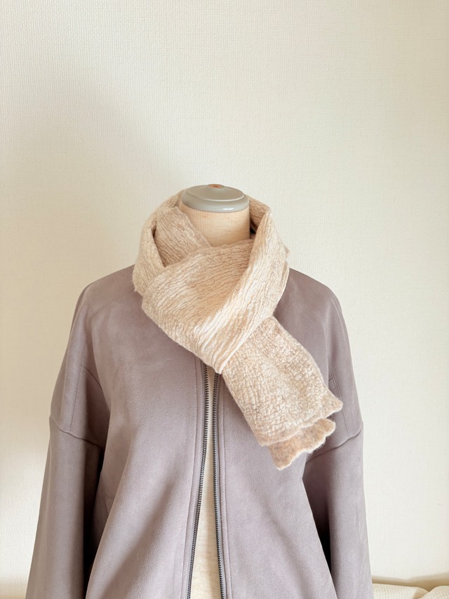 ふわふわ軽いメリノ羊毛とガーゼを和せてフェルティングしたマフラーです。 ナチュラルでやさしいベージュ色 空気を含んで暖かいです。 お素材 メリノ羊毛 コットンガーゼ サイズ 長さ約150CM 幅 約170CM 手洗い可(ウール用洗剤) 写真が実物です。ジャンパーは、商品に含まれません。