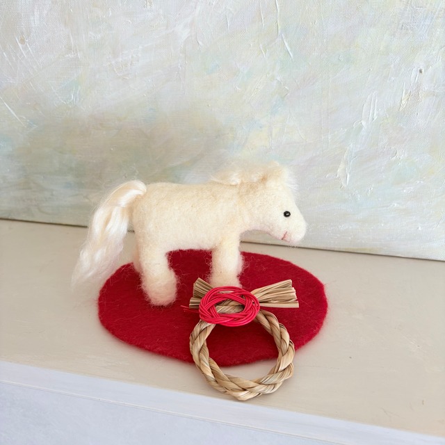 受注製作12月下旬の納品です。 ご注文頂きましてから製作に入ります。 しろいうま の干支セット 来年の干支の馬をモチーフにしてやさしく表現してみました。 玄関やリビングなどいろいろなシーンでお楽しみくださいませ。^^ しろうま、マット、ミニしめ飾り 素材 メリノ羊毛 シルク サイズ しろうま本体 長さ約120mm、高さ約90mm ひとつひとつ手作りのため写真と風合いが異なる場合がございます。 ご了承願います。