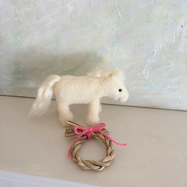 受注製作12月下旬の納品です。 ご注文頂きましてから製作に入ります。 しろいうま の干支セット 来年の干支の馬をモチーフにしてやさしく表現してみました。 玄関やリビングなどいろいろなシーンでお楽しみくださいませ。^^ しろうま、ミニしめ飾り 素材 メリノ羊毛 シルク サイズ しろうま本体 長さ約120mm、高さ約90mm ひとつひとつ手作りのため写真と風合いが異なる場合がございます。 ご了承願います。