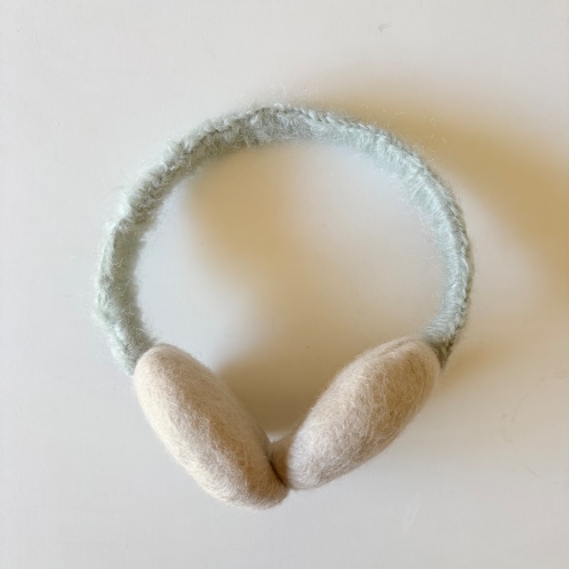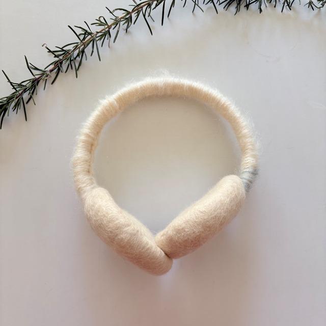 メリノウール羊毛を使いフェルティングしたやわらかく温かいイアーマフ 冬の装いのさりげなくてほっこりやさしいアクセントに・・・ 耳があたる部分は、柔らかなメリノ羊毛 ヘッド部分は、モヘア糸を編み込んでいます。 手洗い可能 商品が実物です。 5枚目の写真は、お色違いと並べてみました。参考にしてくださいね。 素材・メリノウール 、羊毛 サイズ・全長約190mm・95mm 1点1点手作りの為多少の誤差は、ご了承願います。