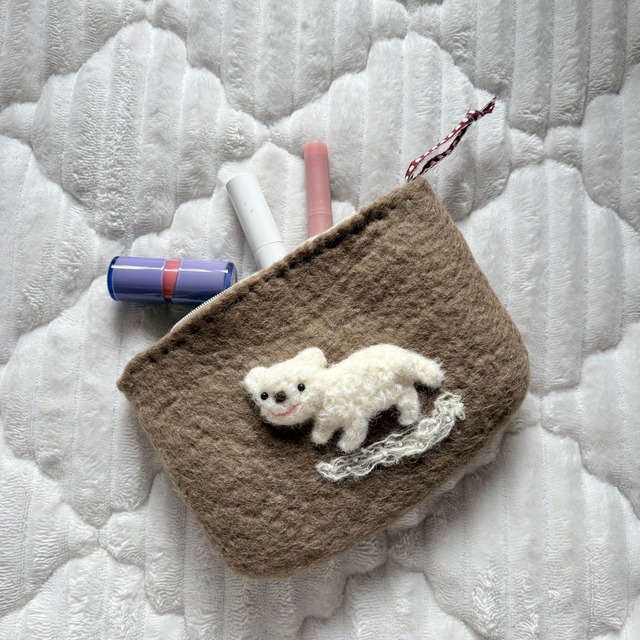 おさんぽラムキンのフエルトポーチです。 シロクマさんがが雪上をおさんぽしている。ほっこりするような情景です。 お気に入りのリップをしまうとき、 カバンの中をのぞいたとき、 ふわりとこころがゆるむような そんな“ひと休み”を、おともに。 フェルトならではのあたたかい手ざわりと、 手刺繍の優しい表情をお楽しみください。 コスメポーチとしてもお使い頂いたり文房具を入れたり色々なモノを入れて楽しんでくださいね。 素材 メリノウール サイズ 約190mm、約145mm 羊毛から手作りしているため多少の誤差は、お許しくださいませ。 エマールなどのウール用洗剤で手洗い可能です。 ギフトにもお使いいただいております。 無料ラッピングしておりますのでお申し付けくださいね。 一つ一つ手作りのため写真と若干異なる場合がございます。