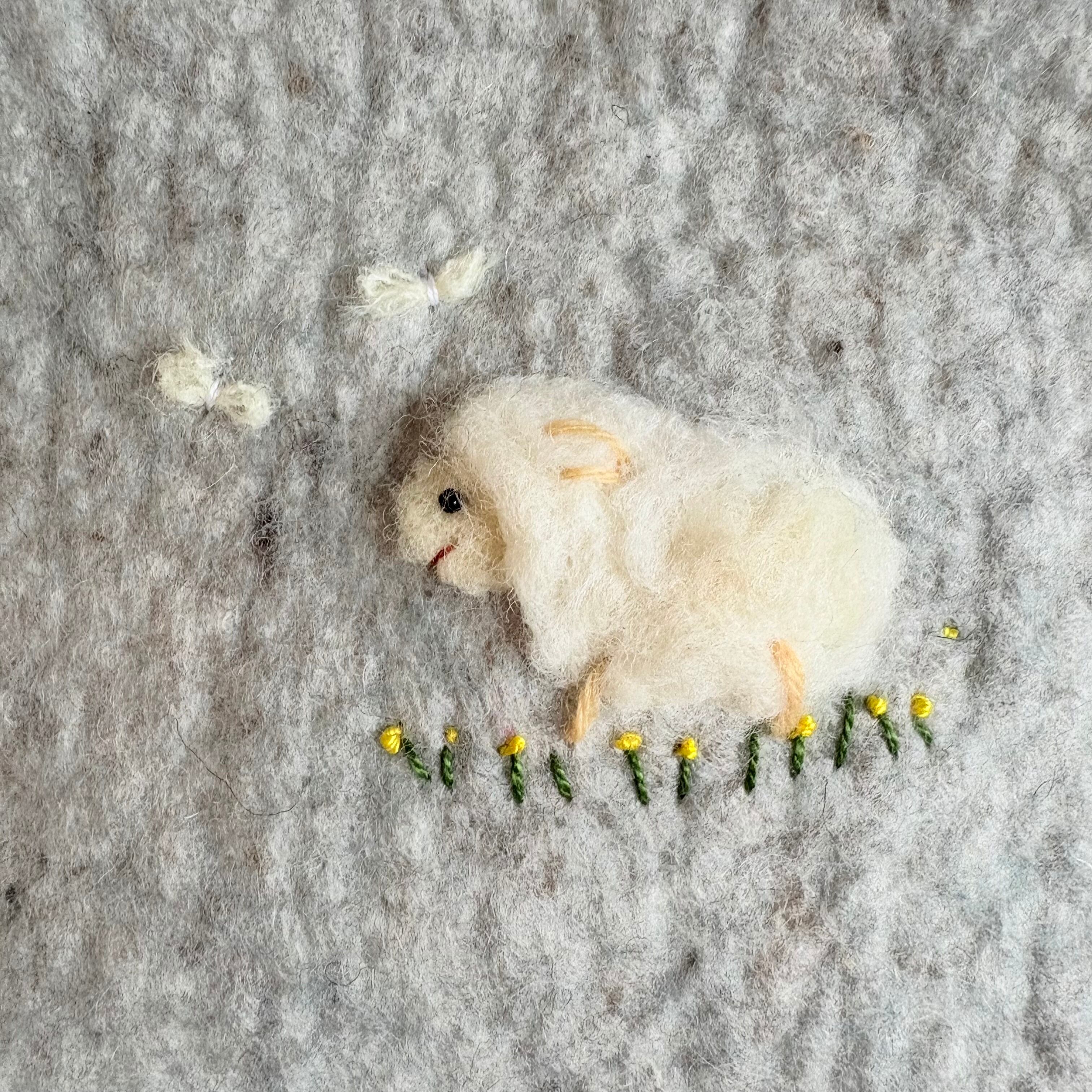 草原とかわいいラムキンの刺繍、お花も咲いています。