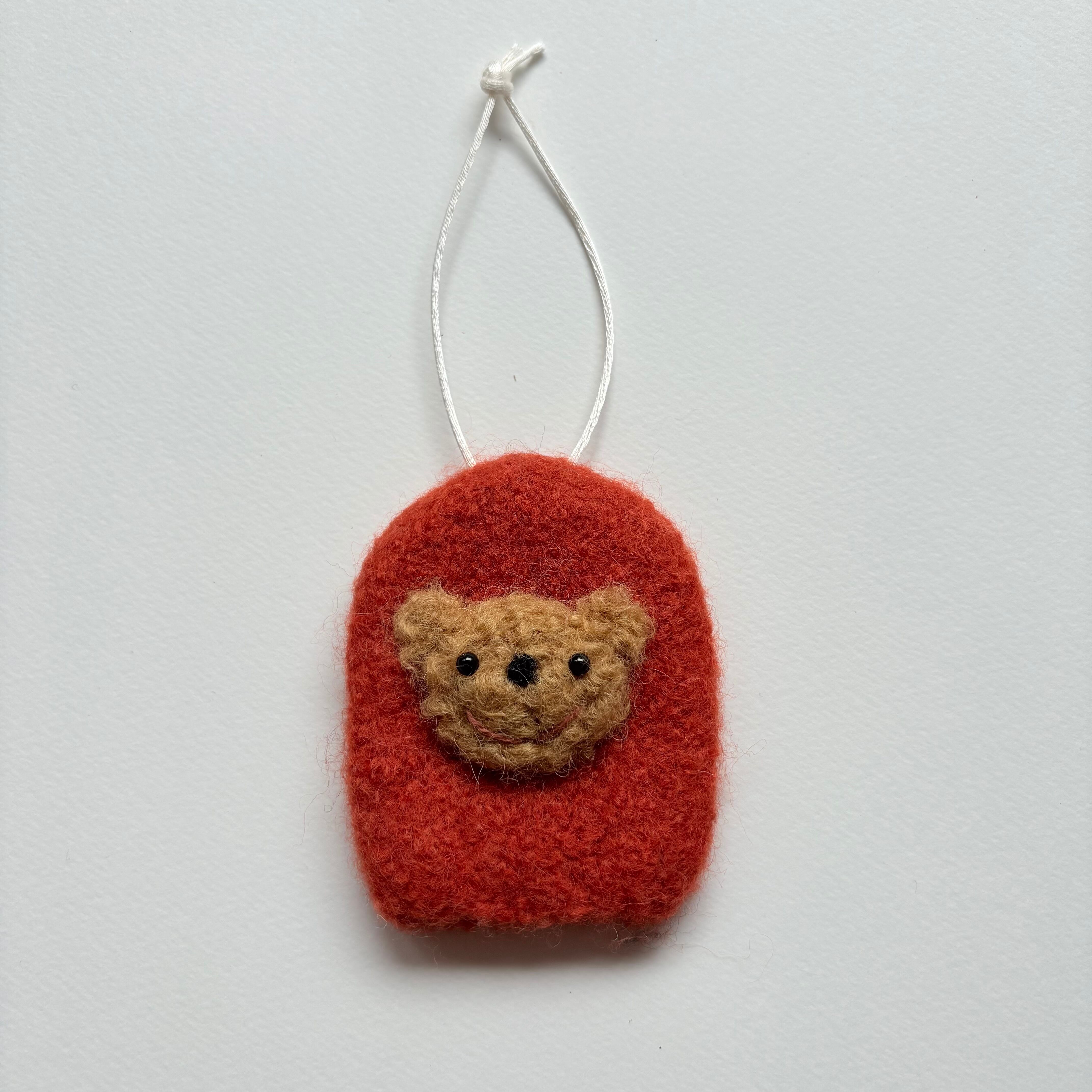 生地は、約2倍の大きさにメりノ毛糸を編んで縮絨させて(フェルト化)して仕上げました。