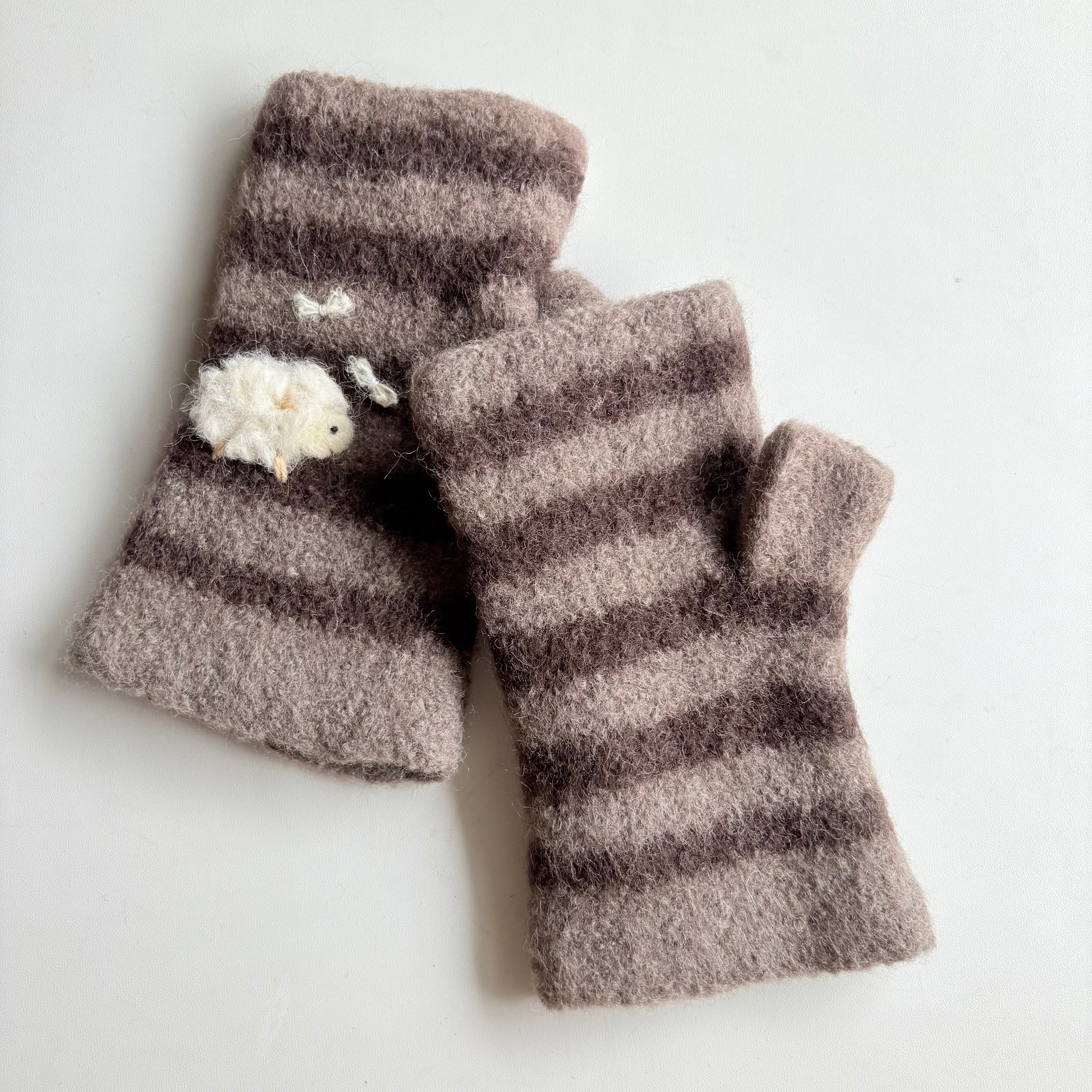 手編みの手袋をフェルト化させて密度を高めた温かい指なしミトンです。
