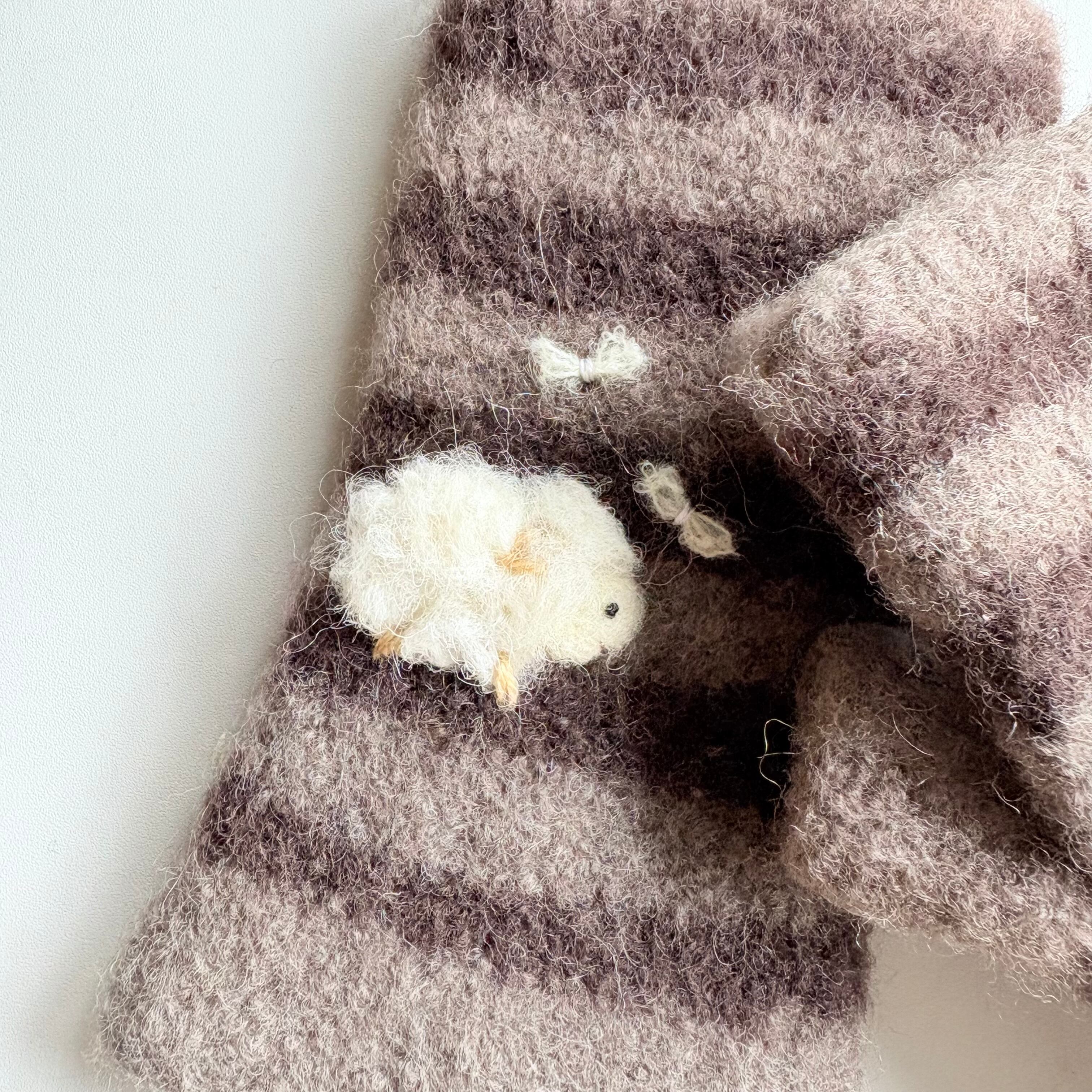 ふわふわラムキンとちょうちょのウール刺繍を施しています。