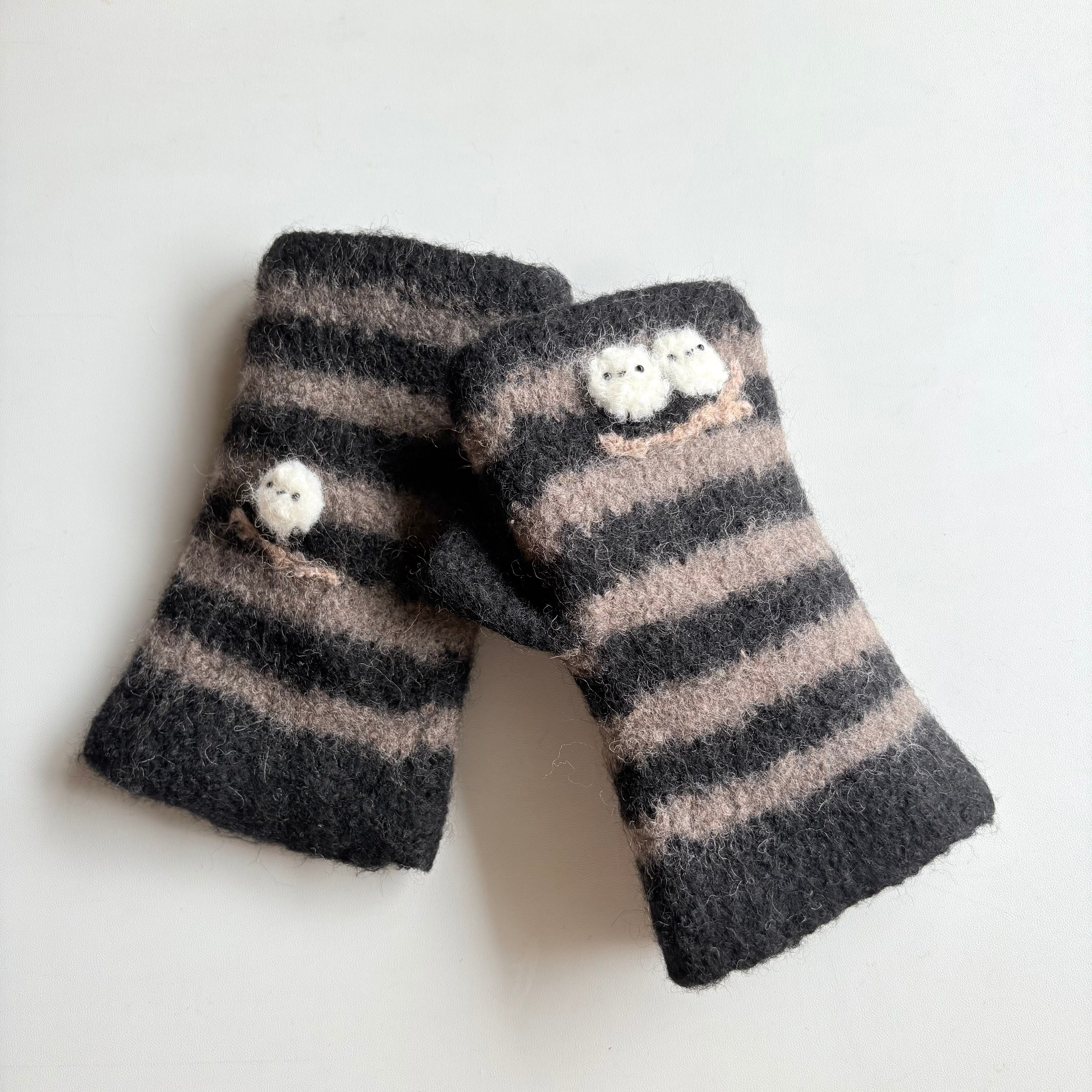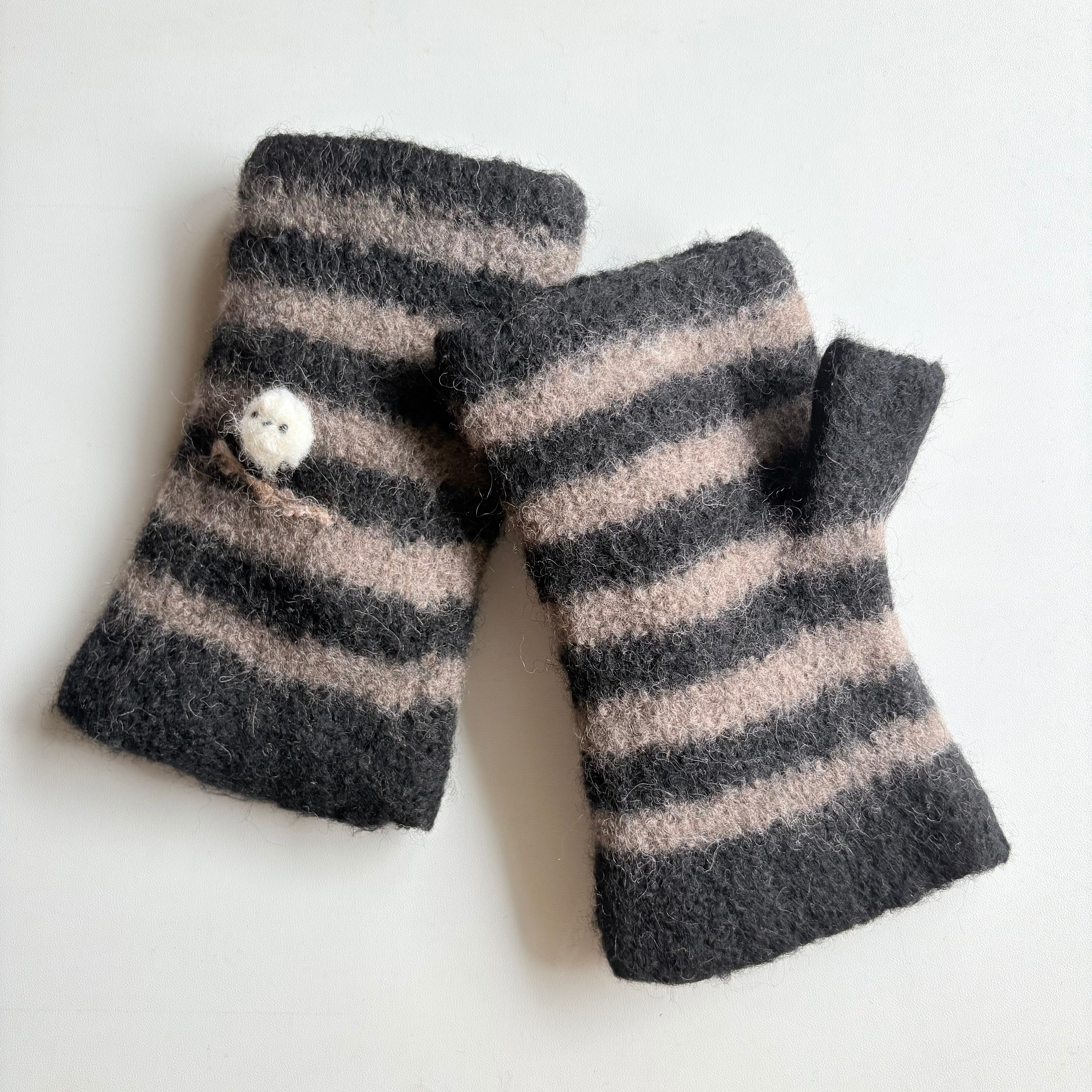 手編みの手袋をフェルト化させて密度を高めた温かい指なしミトンです。