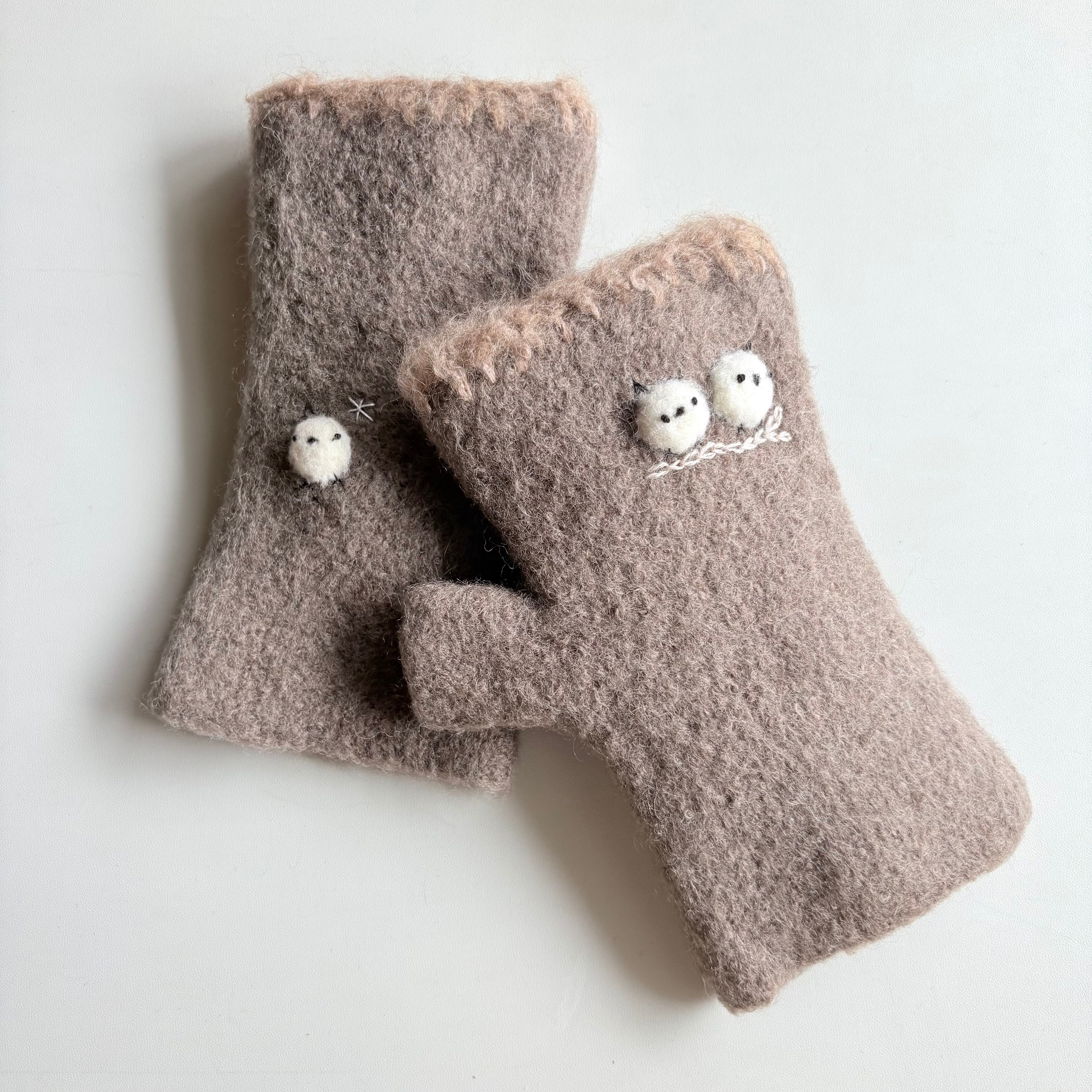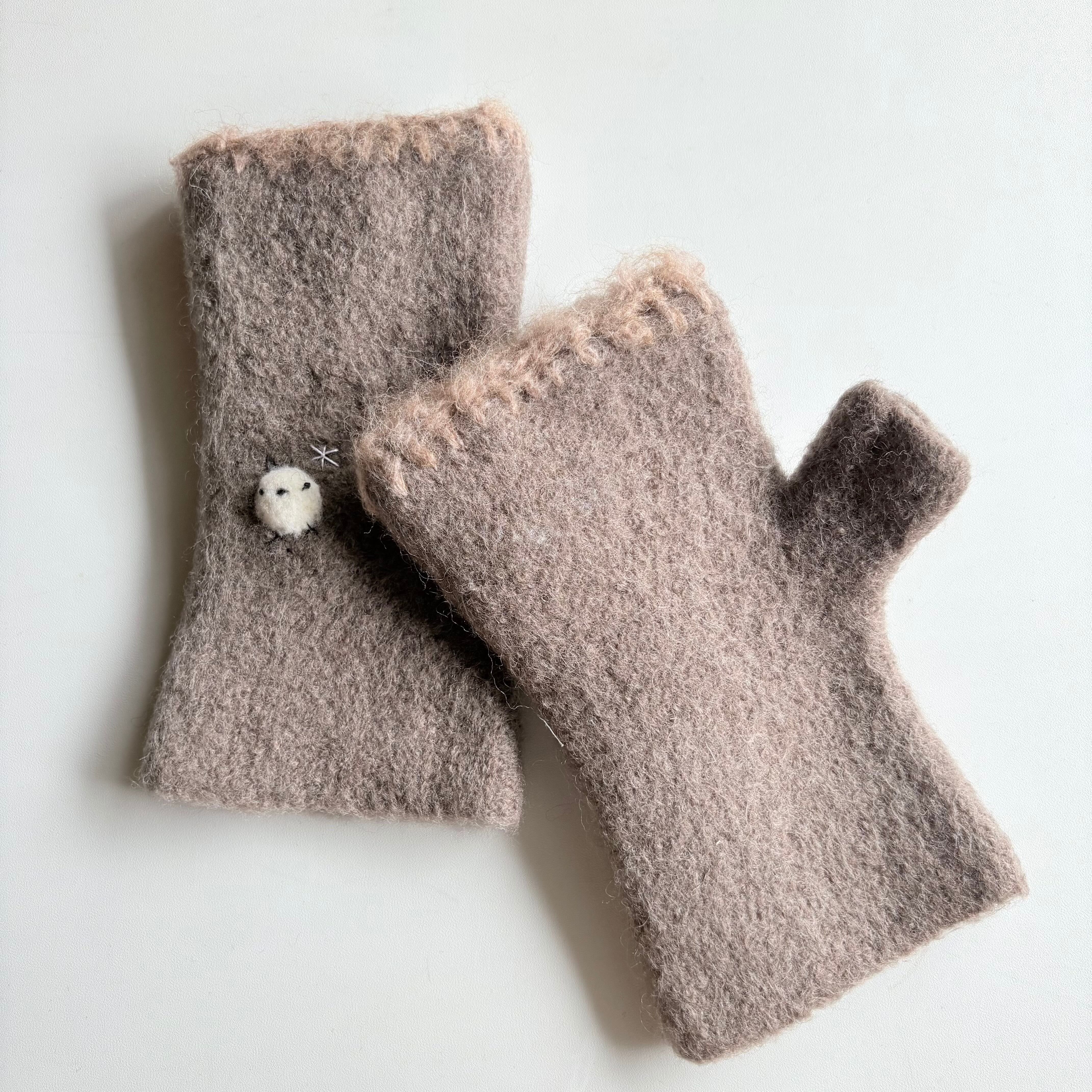 手編みの手袋をフェルト化させて密度を高めた温かい指なしミトンです。