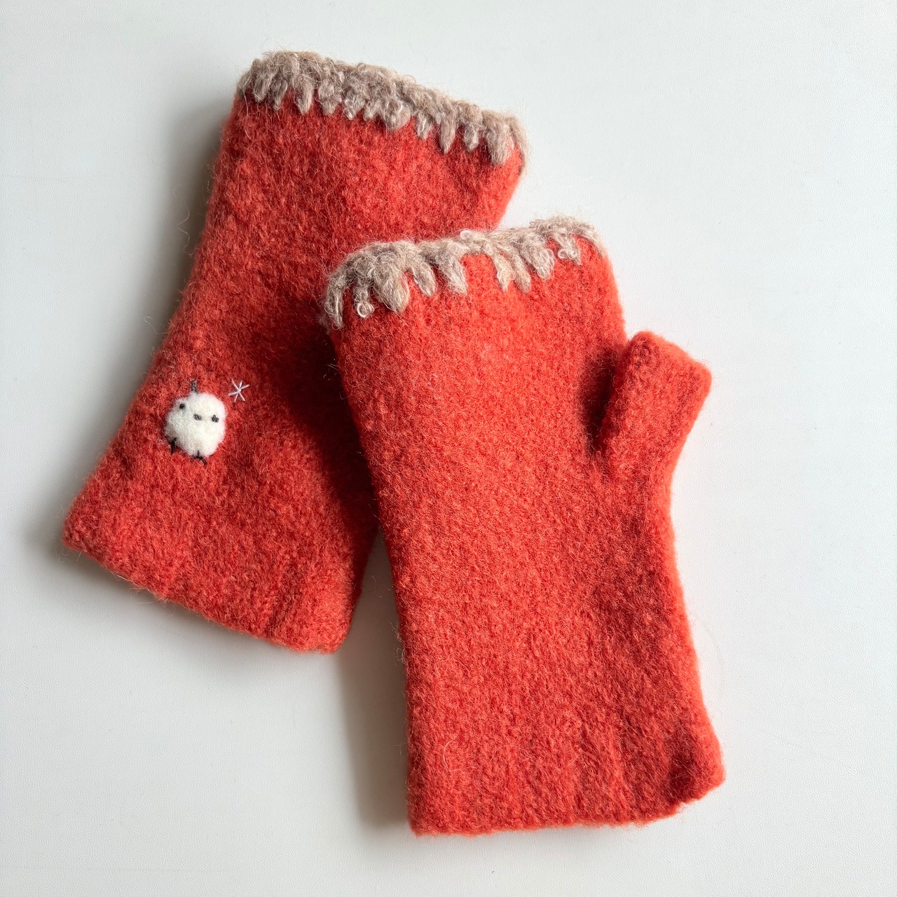 手編みの手袋をフェルト化させて密度を高めた温かい指なしミトンです。