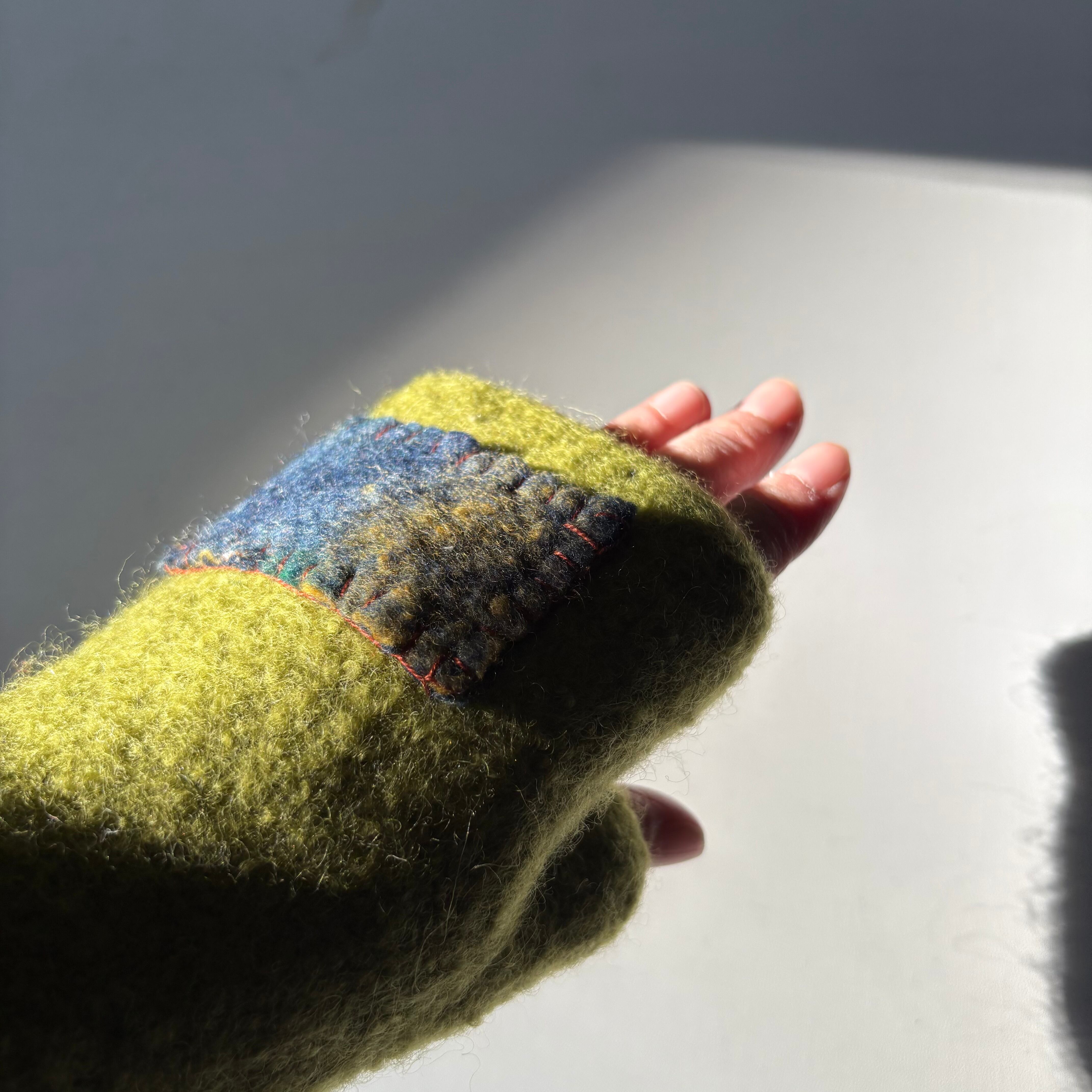 一般的な手袋の2倍くらいの量の毛糸を使い製作してから縮絨させています。