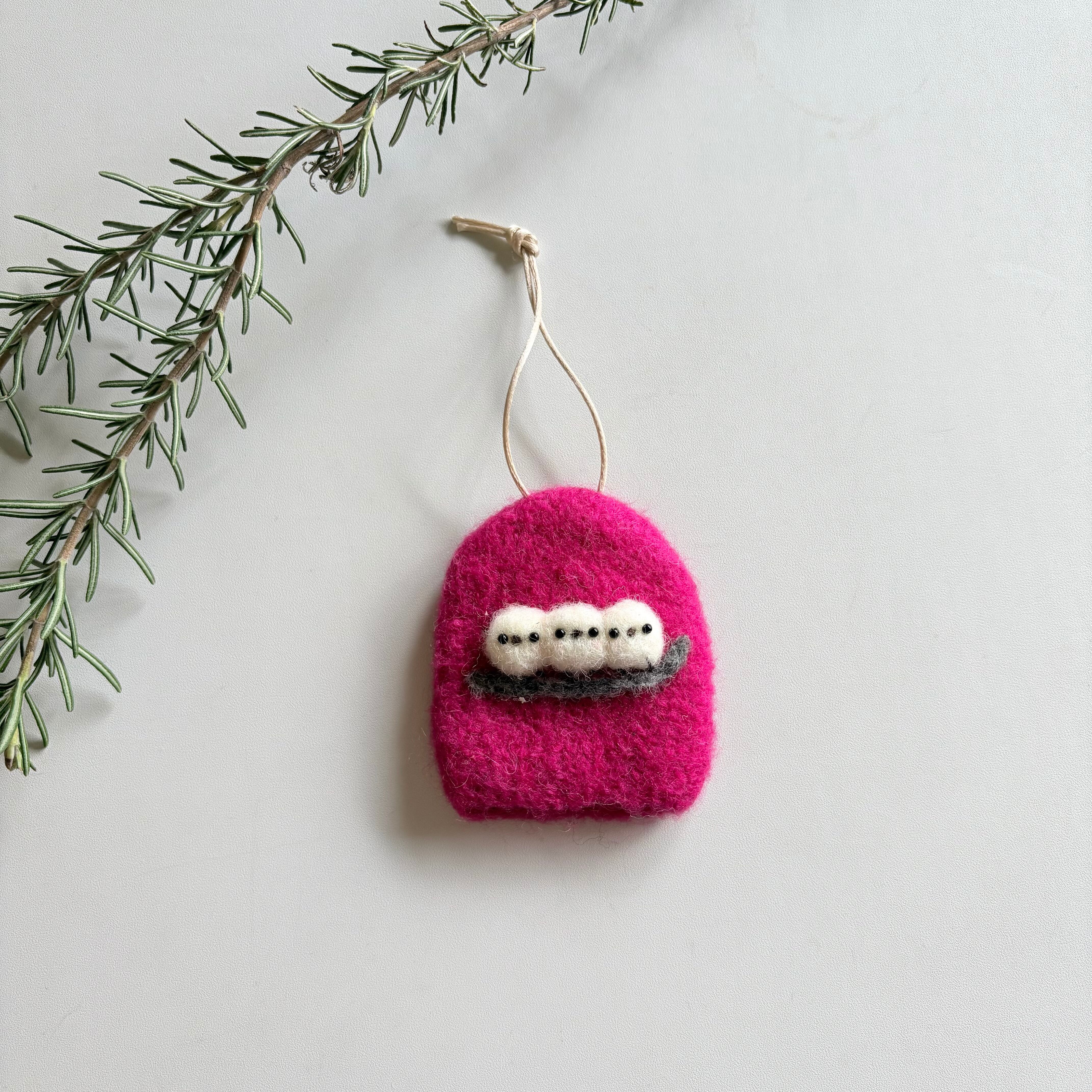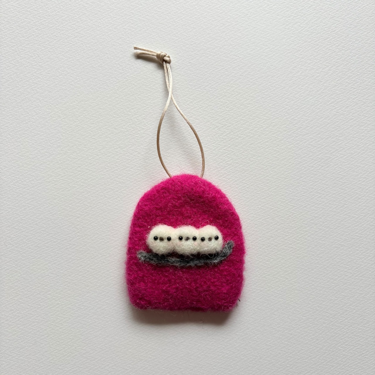 生地は、約2倍の大きさにメりノ毛糸を編んで縮絨させて(フェルト化)して仕上げました。